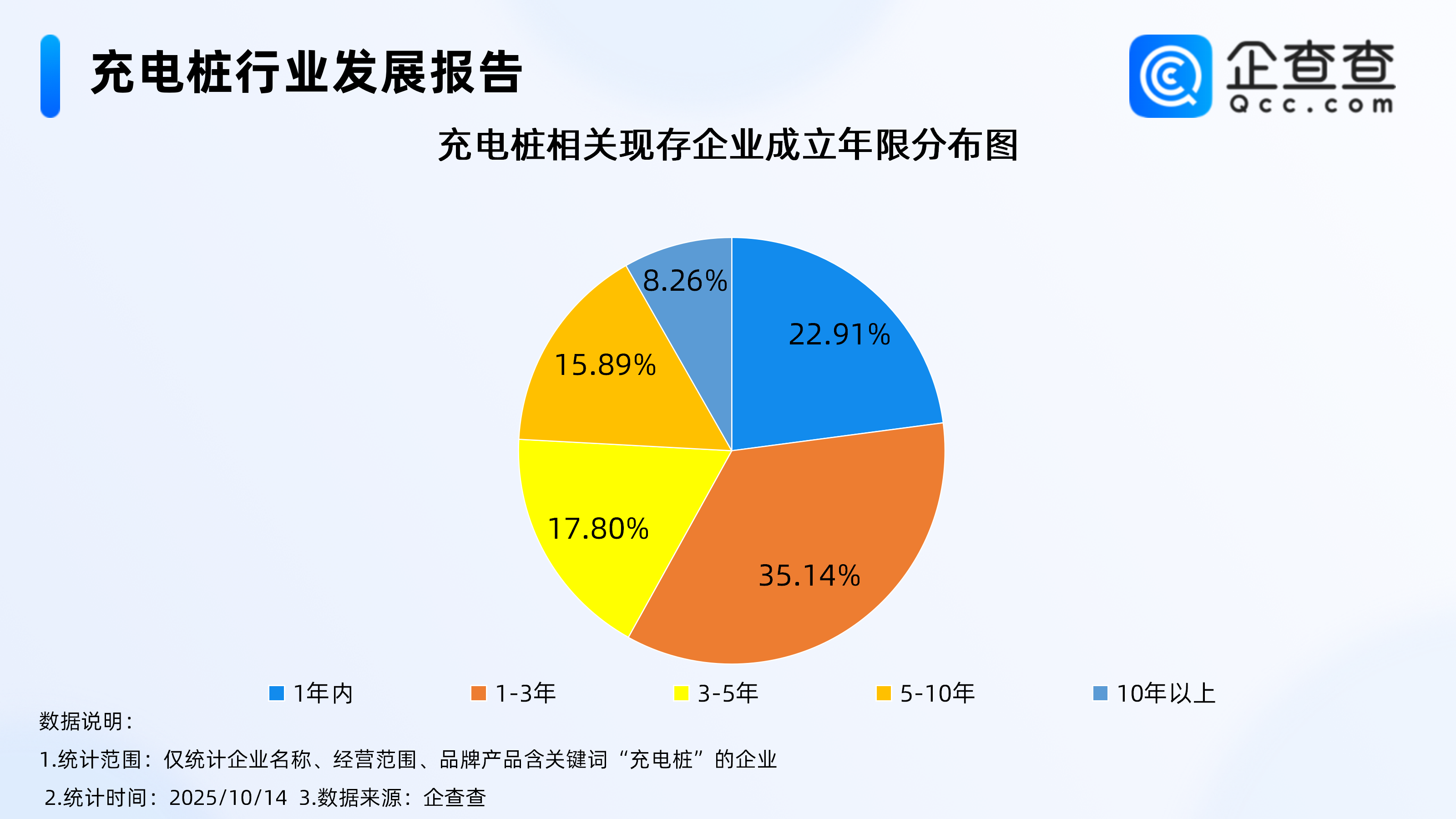 企查查数据显示,截至10月14日,国内充电桩相关现存企业达64.52万家,主要分布在华东地区,占比达32.84%,其次为位于华南地区的相关企业,占比达17.47%。2、近6成相关企业成立于近3年