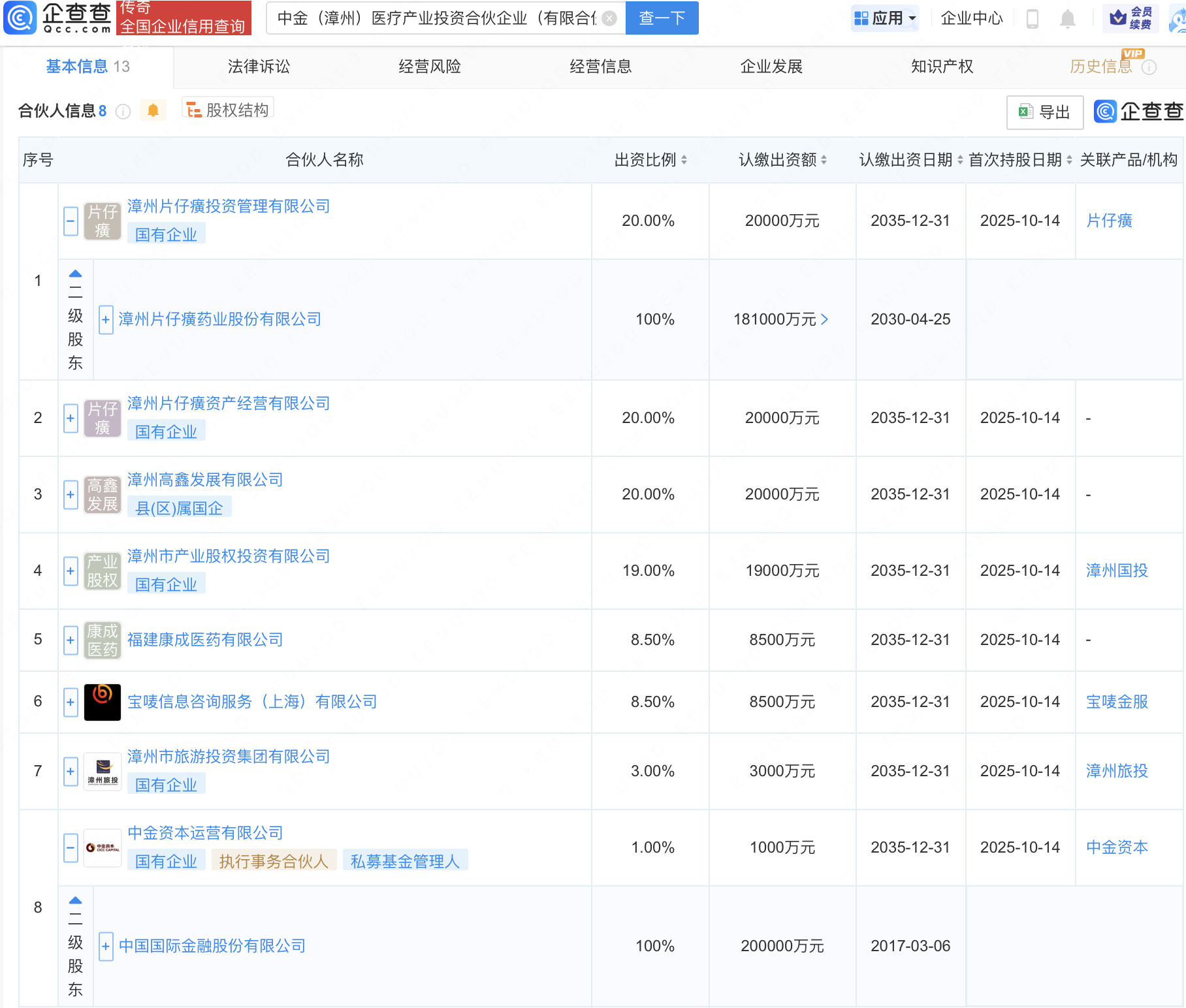 近日在线炒股配资门户网,中金(漳州)医疗产业投资合伙企业(有限合伙)成立,出资额10亿元,经营范围包含:以自有资金从事投资活动。企查查股权穿透显示,该企业由片仔癀(600436)全资子公司漳州片仔癀投资管理有限公司、中金公司(601995)全资子公司中金资本运营有限公司等共同出资。